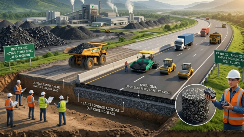 Ketika limbah peleburan nikel bertransformasi menjadi agregat perkerasan, hilirisasi tidak lagi berhenti di gerbang smelter, melainkan melebur langsung ke dalam lapisan infrastruktur