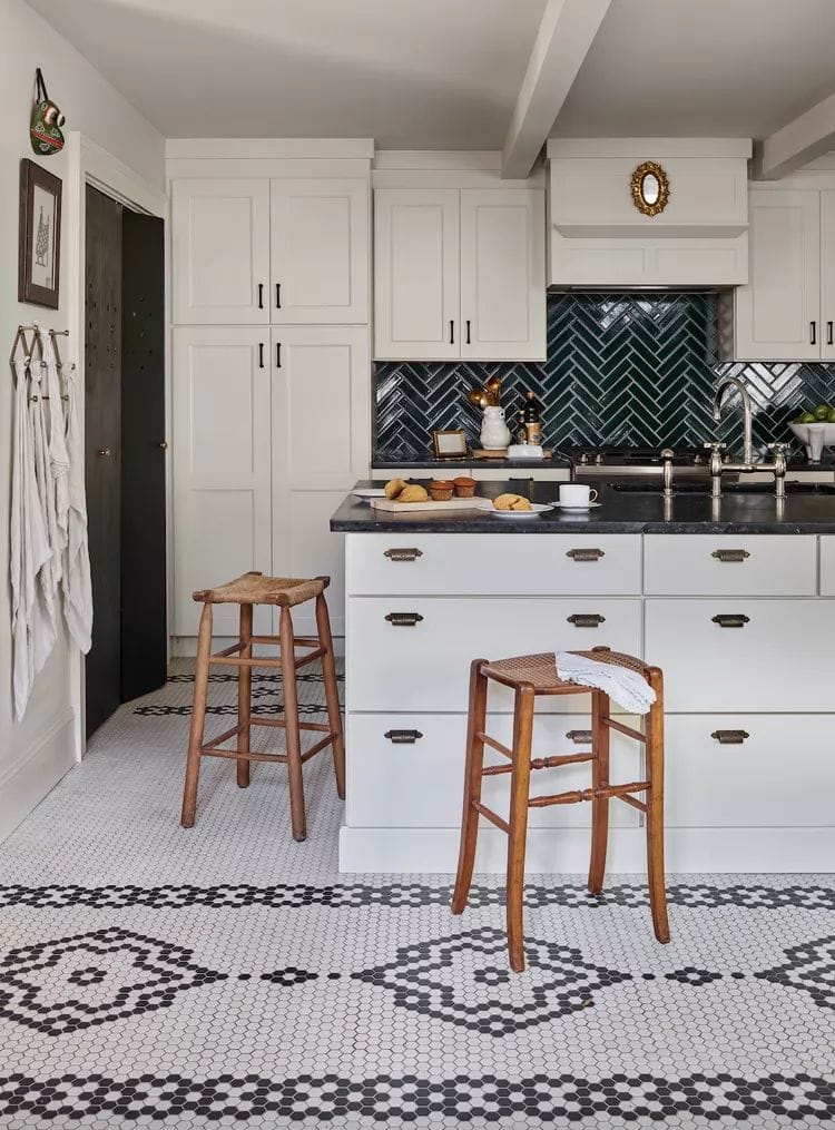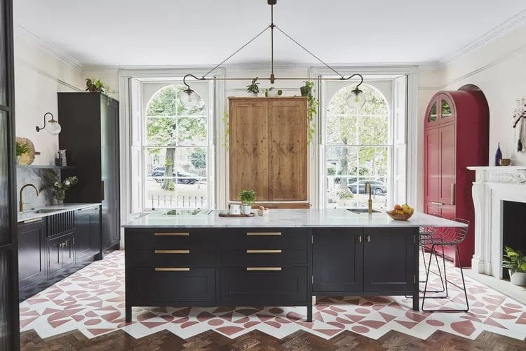 Bukan cuma hitam yang dapat dipadukan dengan putih, tapi merah juga cocok lho. Contohnya pada lantai dapur di atas. Ubin merah putih bermotif geometris ternyata juga bagus untuk mempercantik area dapur rumah.