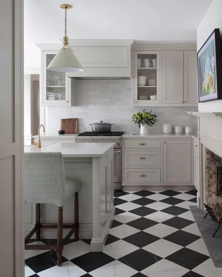 Keramik warna krem dengan semburat motif lembut jadi pilihan yang bagus untuk lantai dapur. Lemari kabinet abu-abu dan beberapa furnitur berwarna hitam justru berpadu sempurna dengan nuansa dapur yang krem. Warna putih juga boleh disematkan pada beberapa bagian untuk dapur lebih segar.